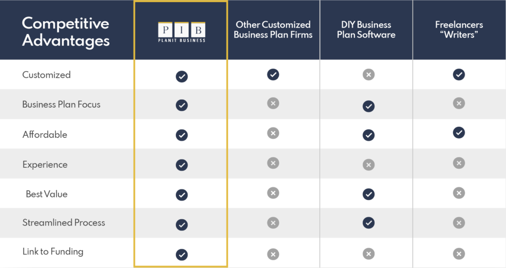 PlanIt Business (“PIB”) is a customized business plan writing company that specializes in business plans written for funding purposes. Our clients seek highly compelling and actionable business plans in order to raise capital in the form of bank loans (commercial and SBA) or equity investment (Friends & Family, Angel Investor, Venture Capital / Private Equity). Our business plans can also be tailored for pitches, proposals, joint ventures, management recruiting, board presentations, etc. Whenever you find the need to ask for something and need a document to represent that ask – – we can help you.